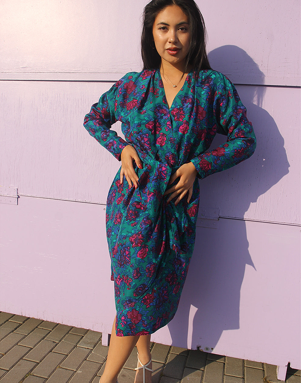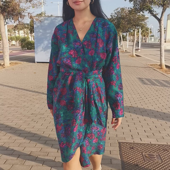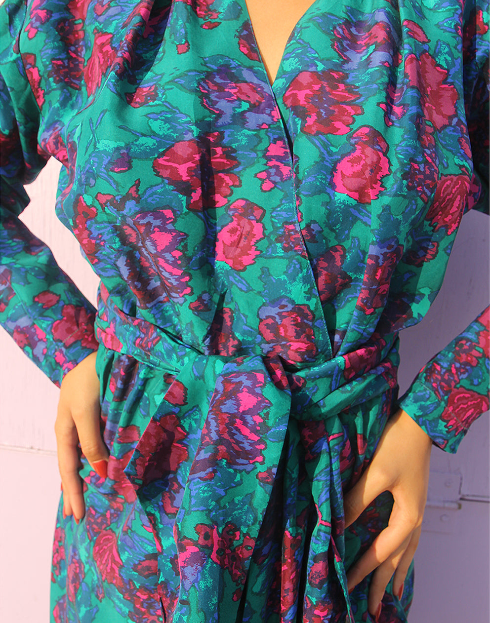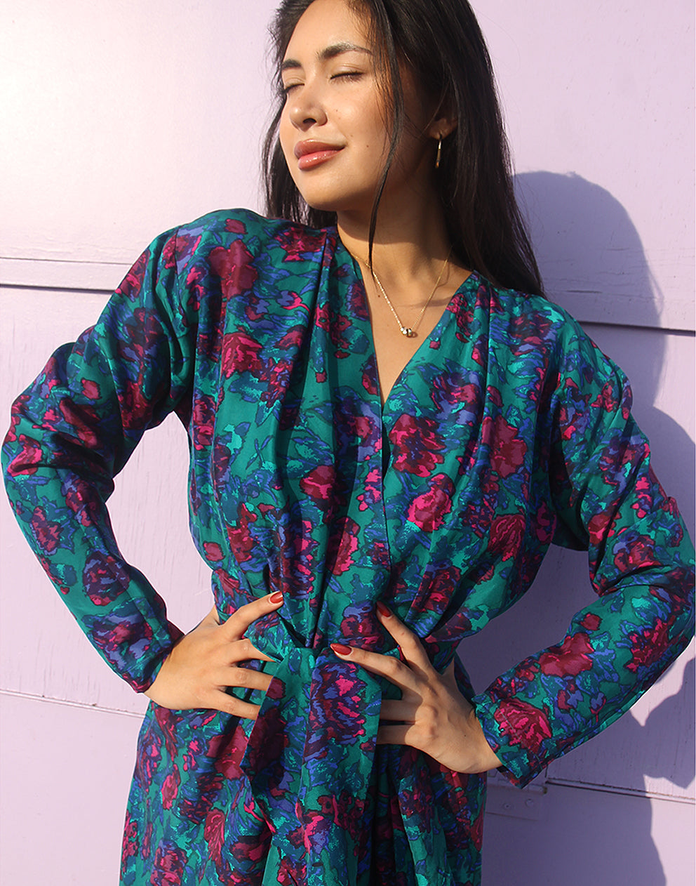 This vintage silk wrap dress in a dreamy green and pink floral print is a timeless piece of womens vintage fashion. Made from pure silk and fully lined, it features a deep V neckline, long sleeves, and a flattering wrap silhouette that accentuates your natural shape. Elegant and easy to wear, it’s perfect for weddings, evening events, and everything in between.