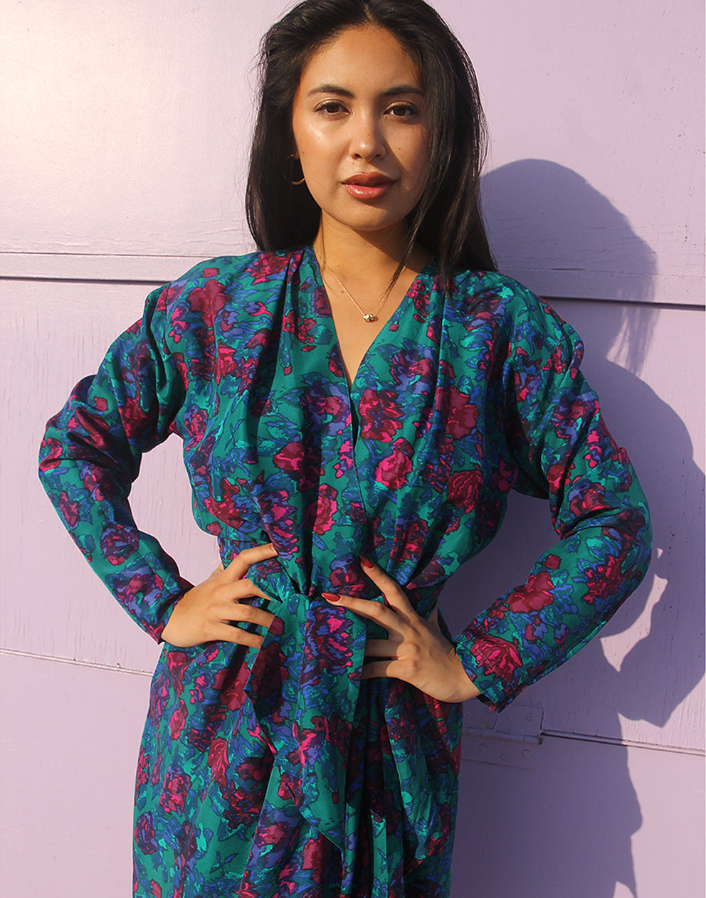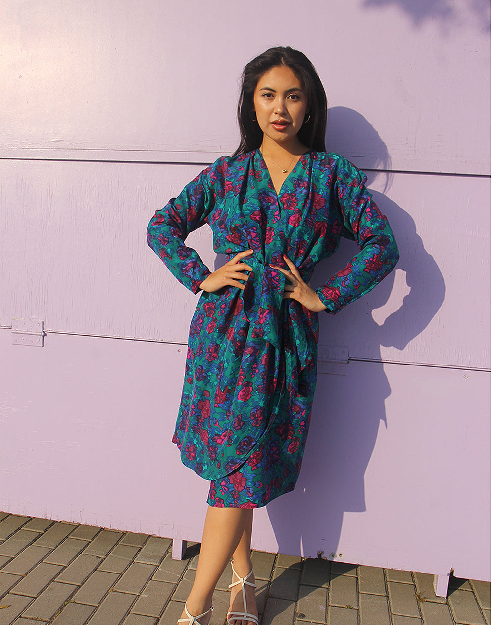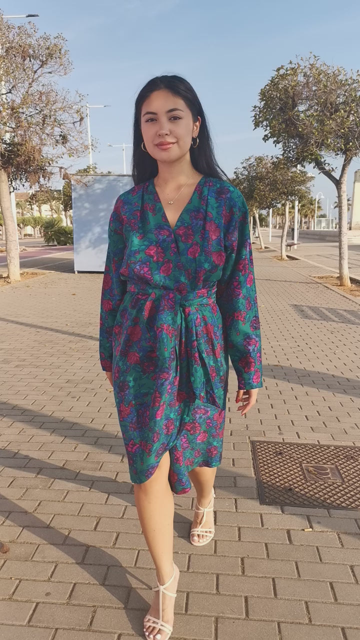 This vintage silk wrap dress in a dreamy green and pink floral print is a timeless piece of womens vintage fashion. Made from pure silk and fully lined, it features a deep V neckline, long sleeves, and a flattering wrap silhouette that accentuates your natural shape. Elegant and easy to wear, it’s perfect for weddings, evening events, and everything in between.