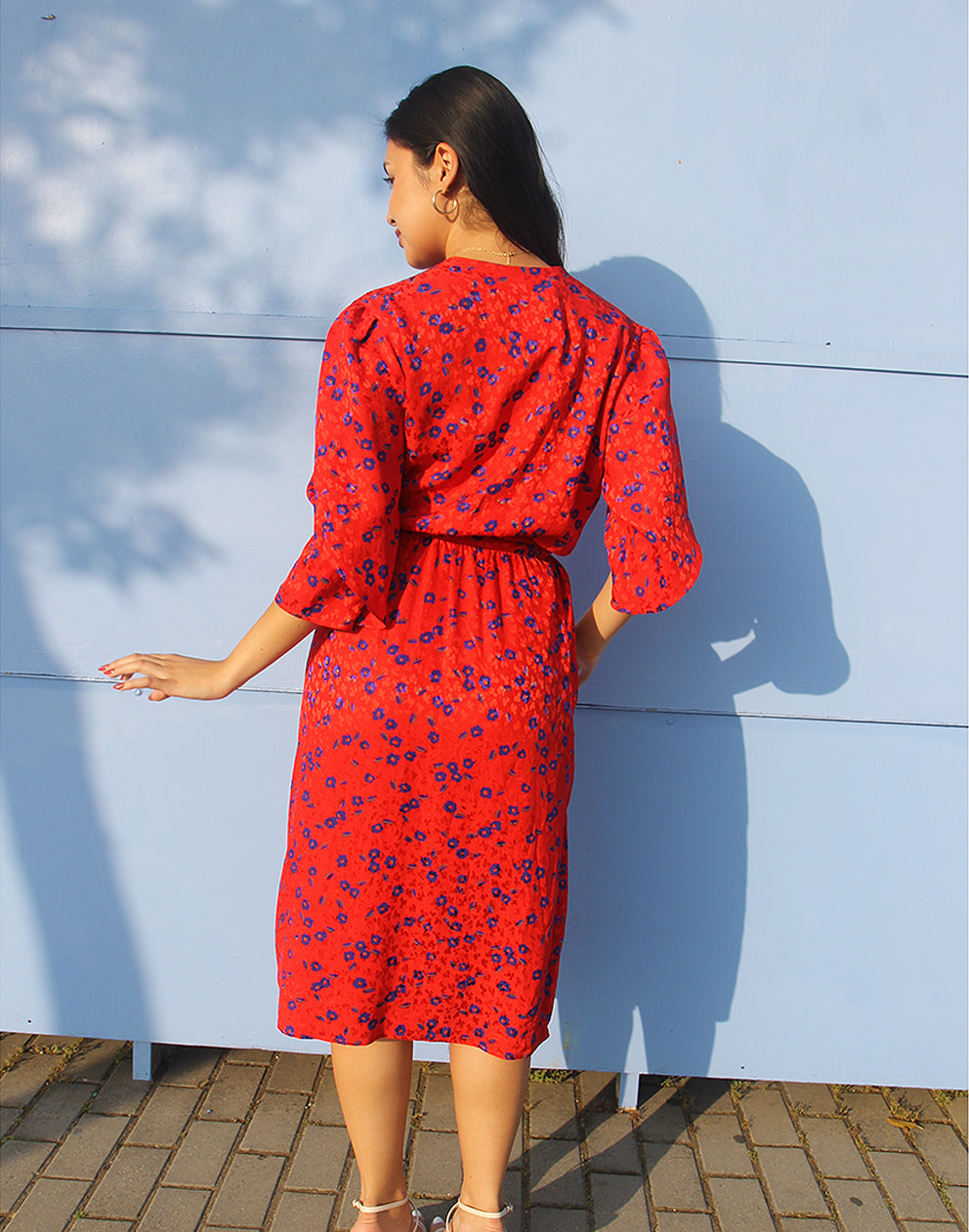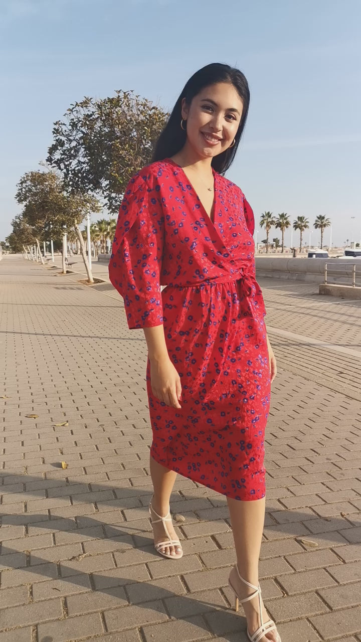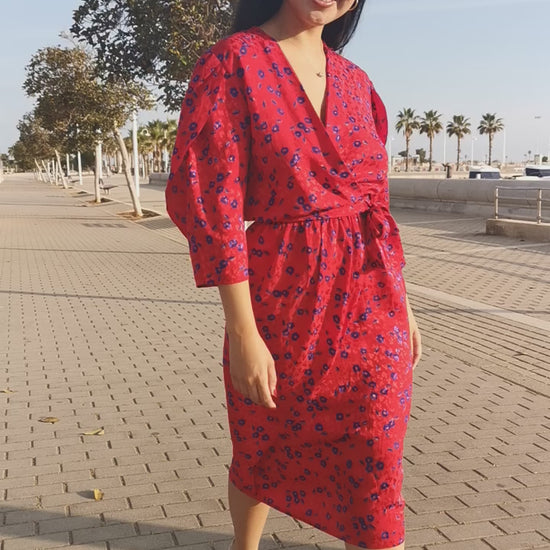 Make a statement at your next event with this vintage red dress featuring a stunning blue floral print. The V neckline and half sleeves offer a classic, feminine silhouette, making it ideal for a variety of occasions, from a summer wedding guest dress to a stylish evening dress or formal dress.
