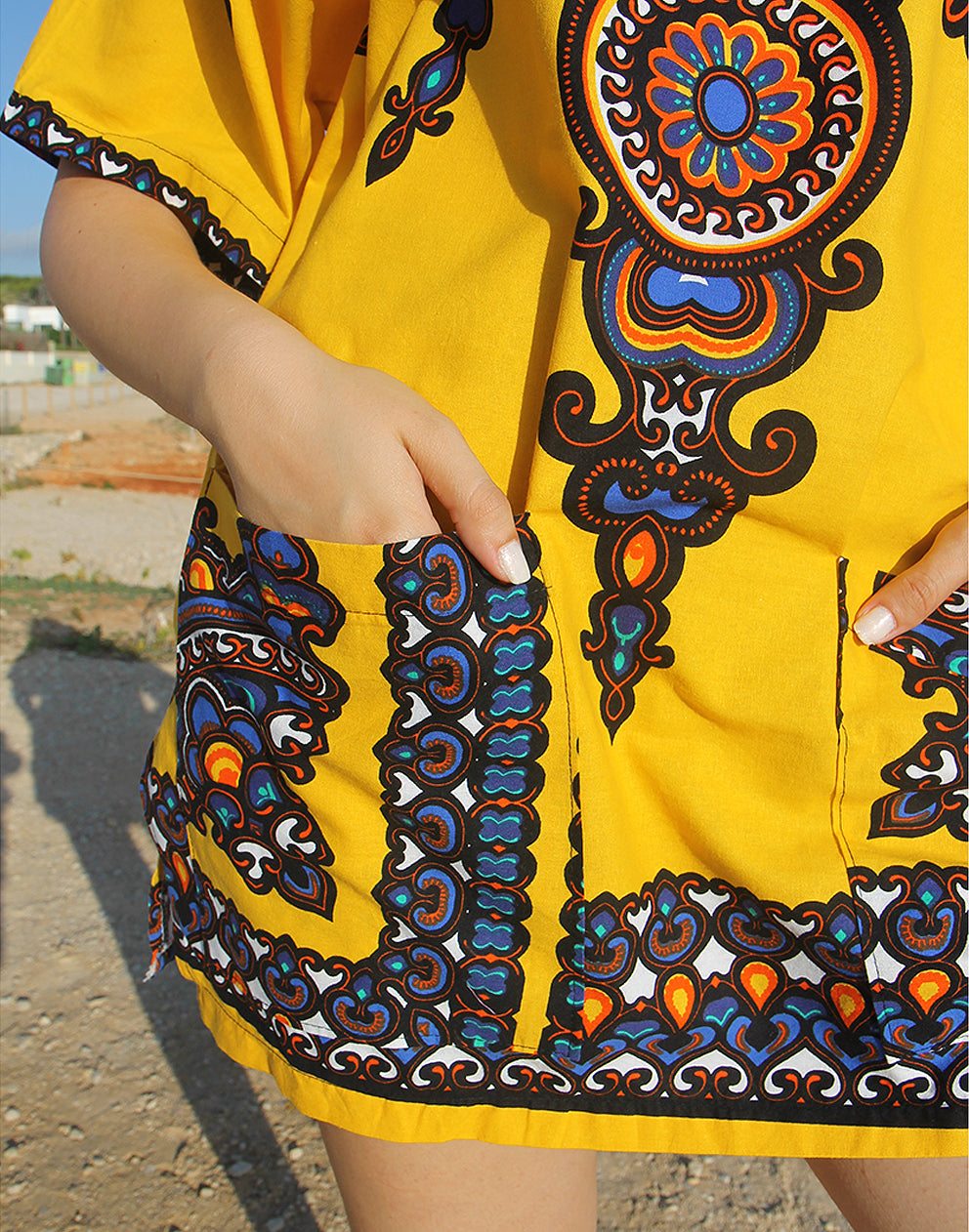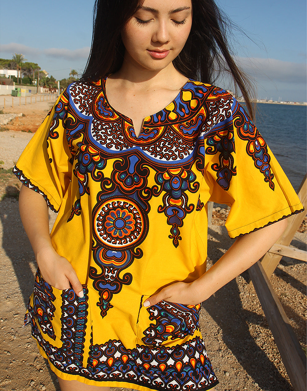 Brighten up your beach days with this yellow kaftan beach cover up. Designed with a flattering V neckline and half sleeves, this vibrant beachwear piece is perfect for throwing over your swimsuit or bikini. Its beautiful printed neckline and sleeves add a unique, eye-catching touch to your summer style.