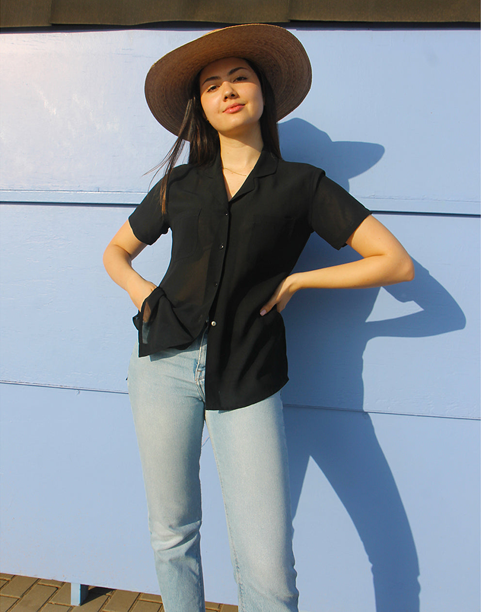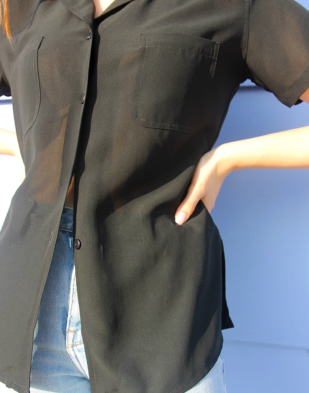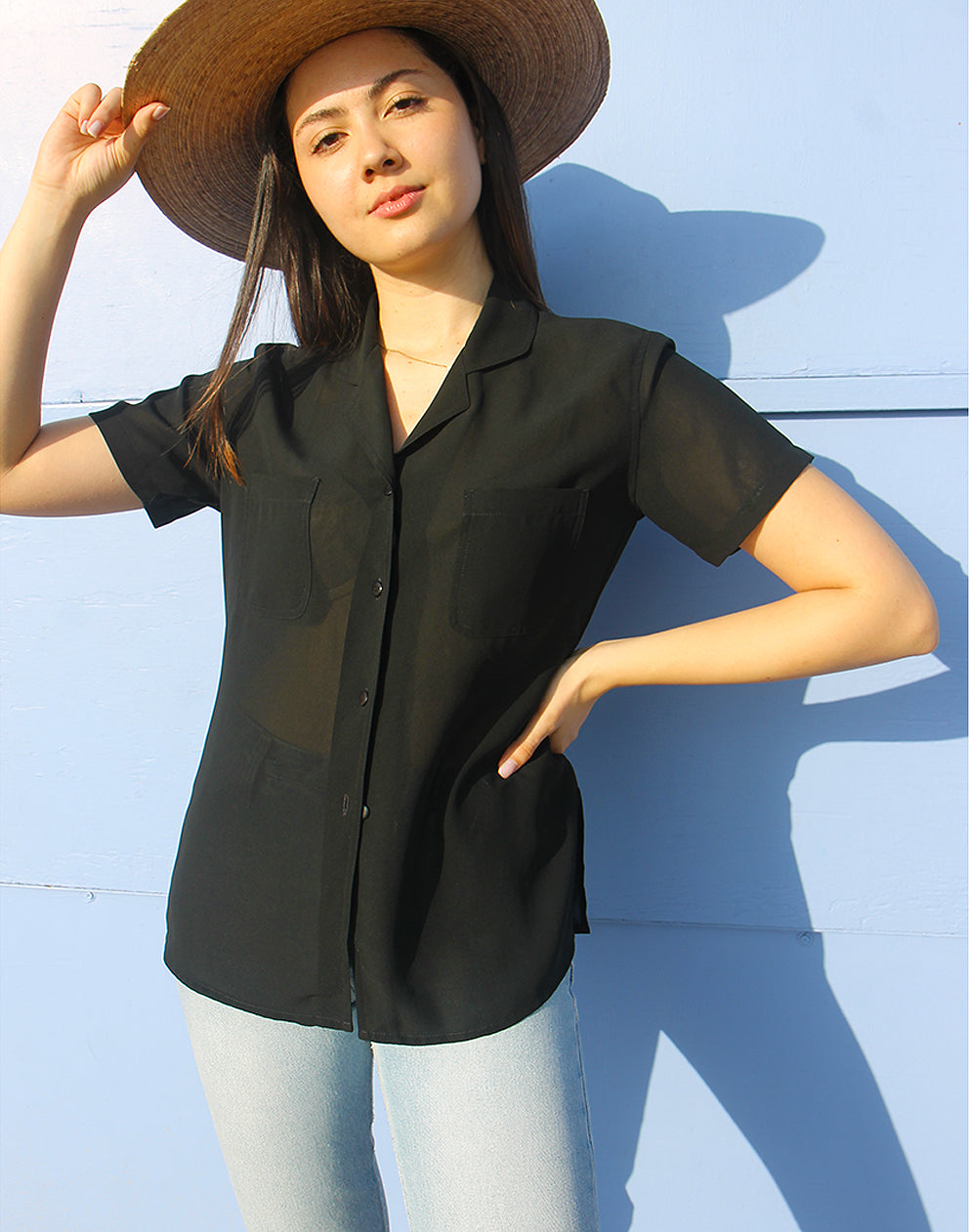 A timeless black shirt perfect for day-to-night wear. This vintage women’s shirt features a collared V-neckline, short sleeves, double chest pockets, and a semi-sheer finish. A classic shirt that works just as well for workwear as it does for casual styling.