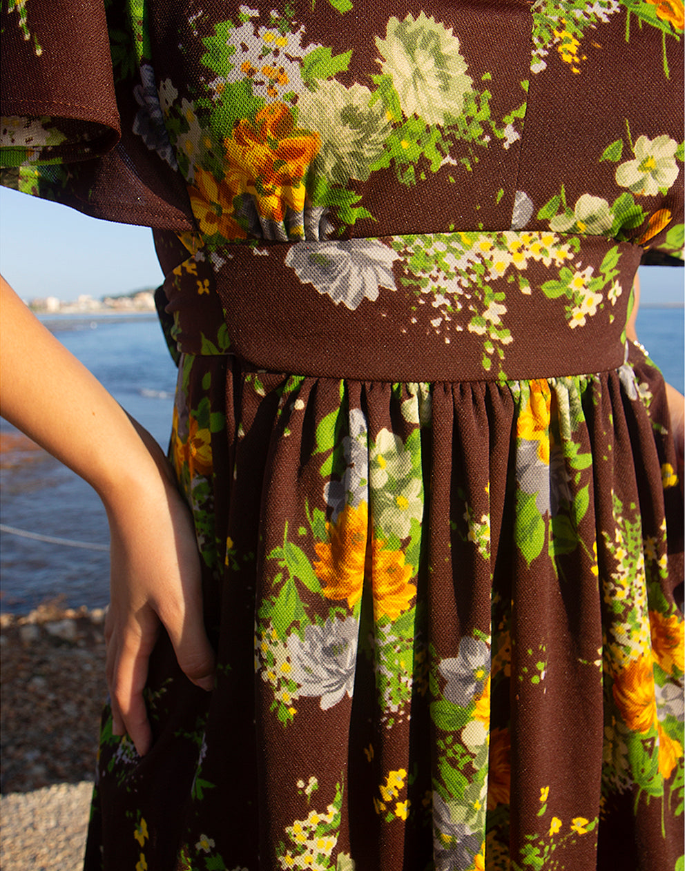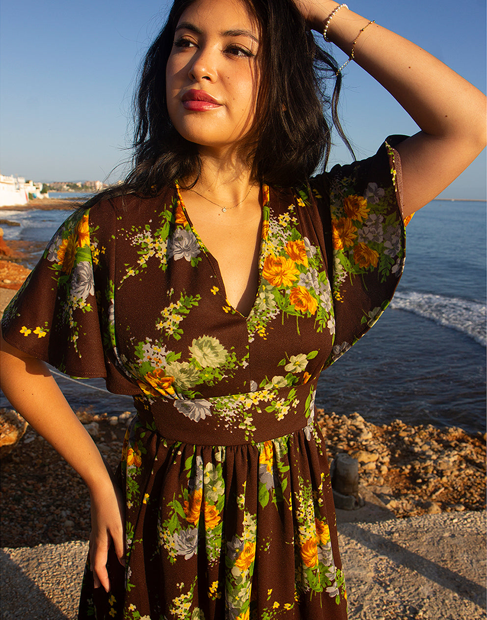 Step into retro charm with this 1970s brown floral maxi dress. Designed with a flattering V-neckline, short sleeves, and a waist tie to define your silhouette, it features a rear zipper for easy wear. Effortlessly boho and timeless, this vintage maxi is perfect for summer events, festivals, or everyday standout style.