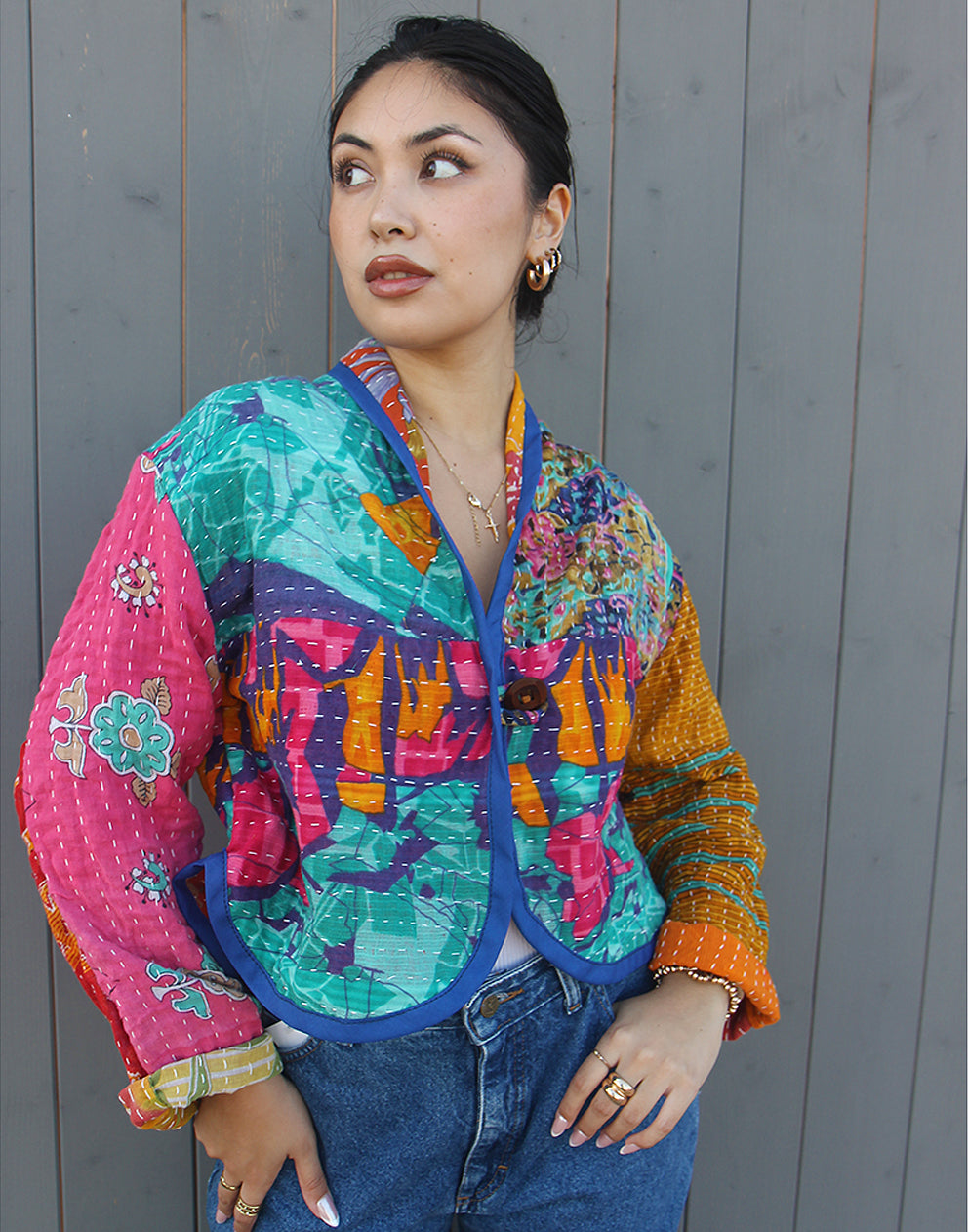 This colourful printed womens jacket is reversible, lightweight, and made from 100% cotton. Handmade and sustainable, this quilted jacket is perfect for layering and pairs beautifully with denim. A unique piece for effortless style.