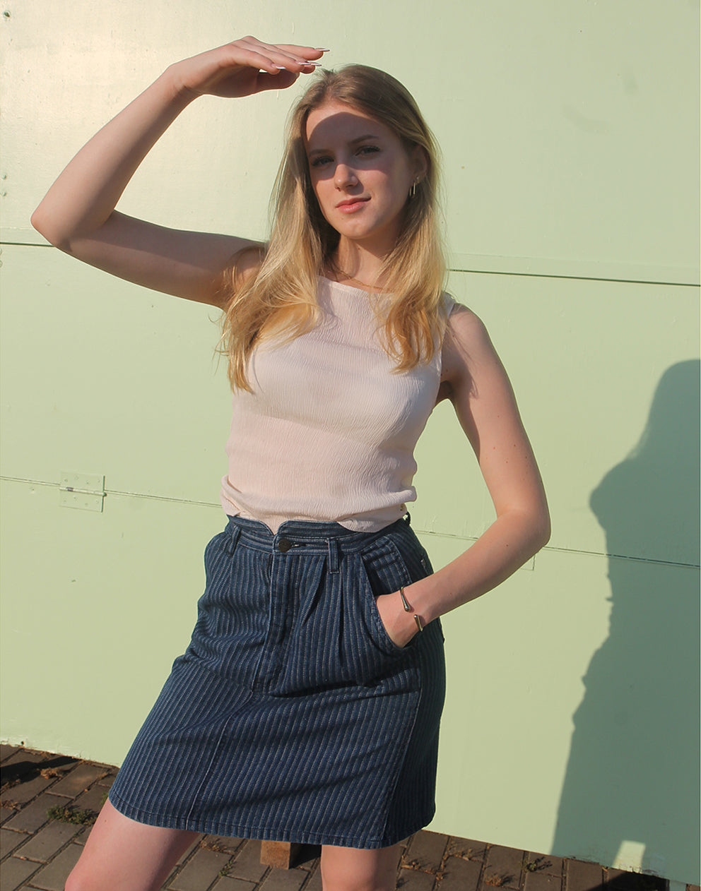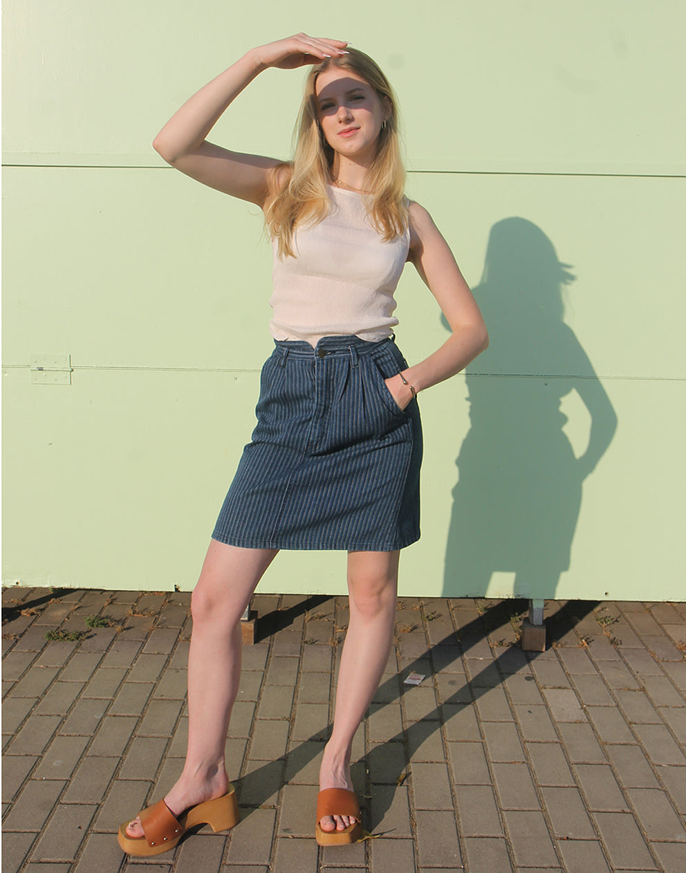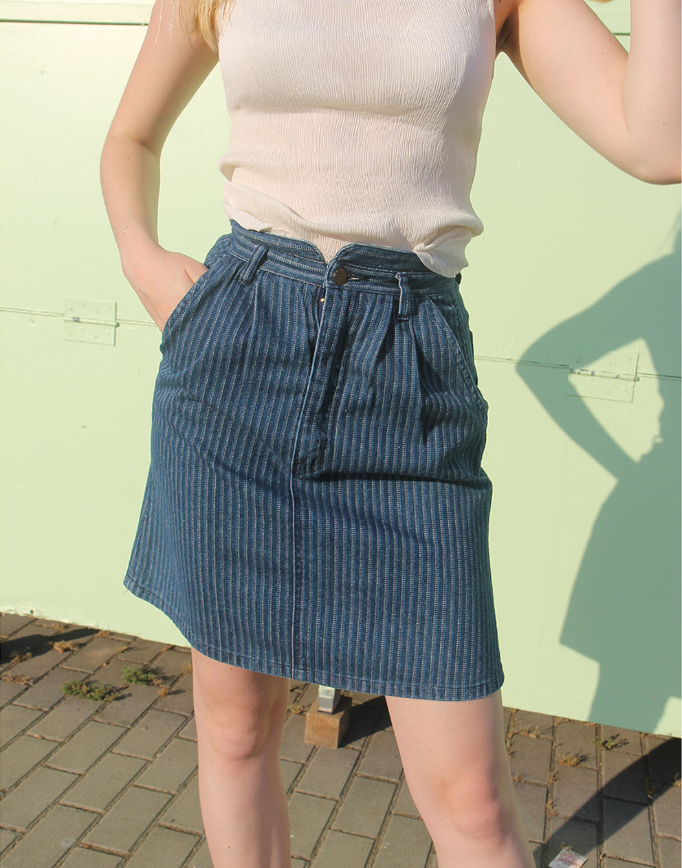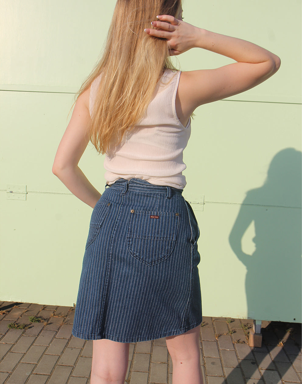 Minifalda vaquera vintage en denim azul con rayas verticales.