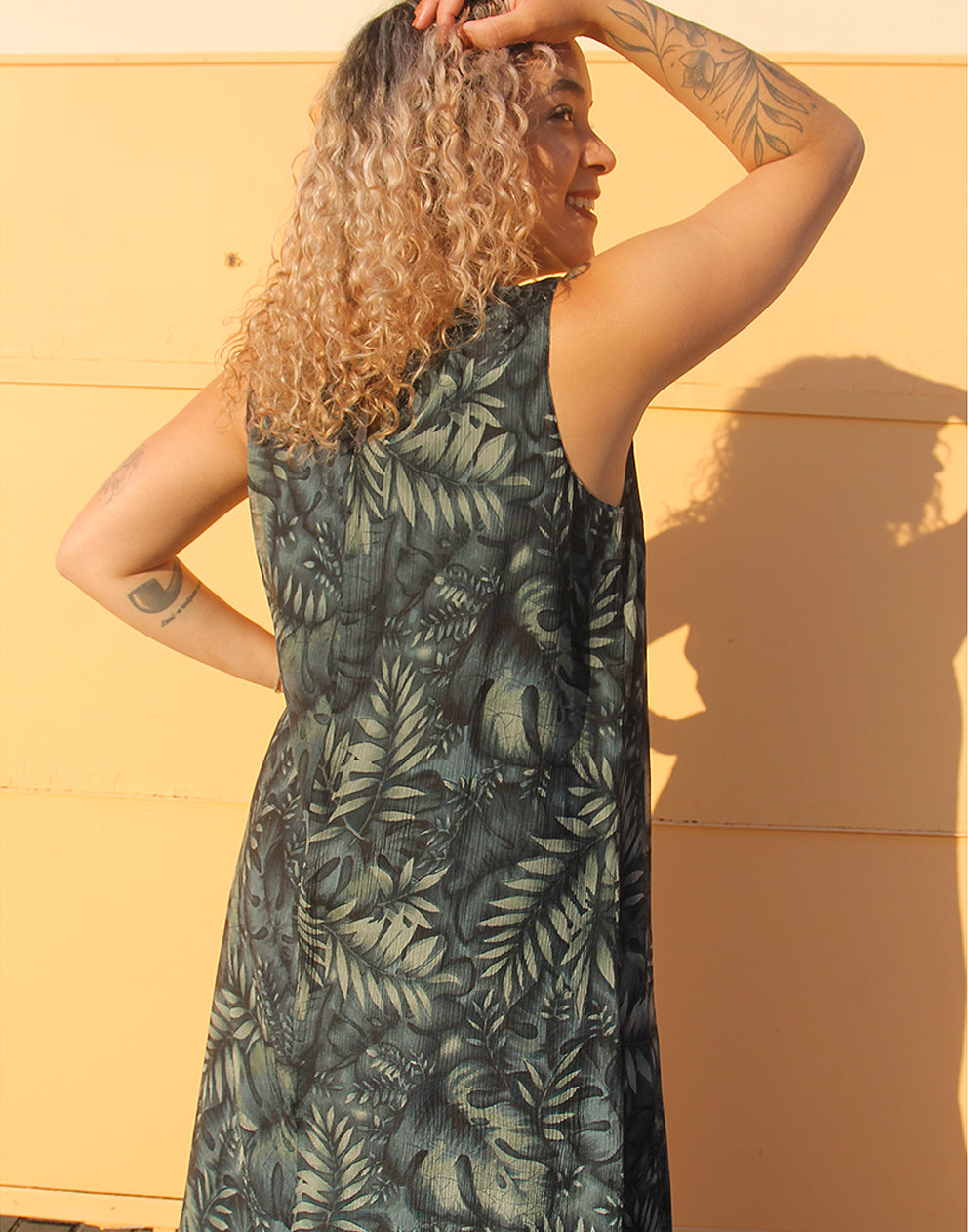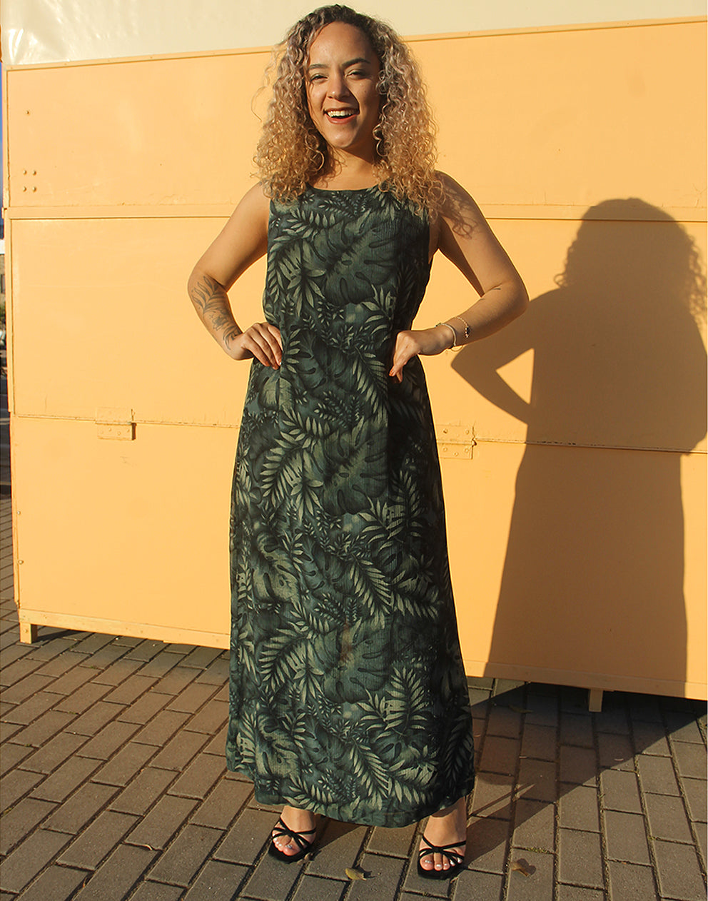 Vestido largo de seda vintage con estampado floral negro y gris.