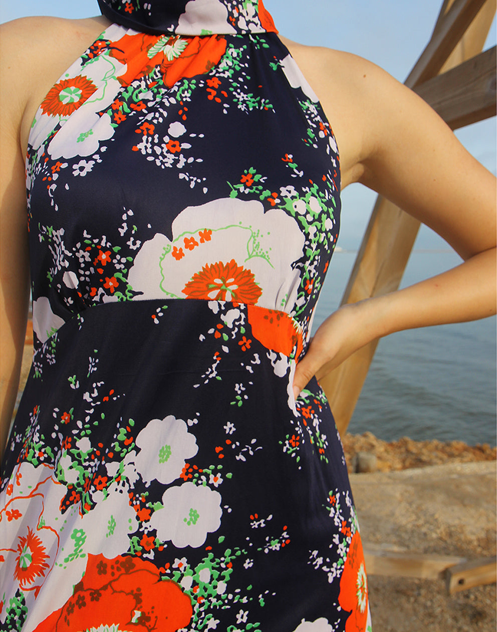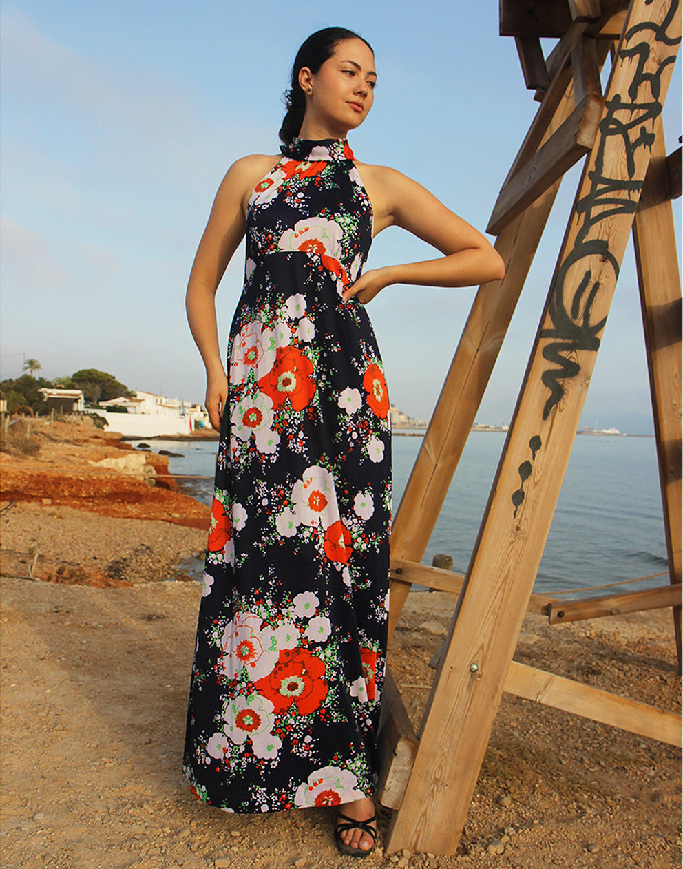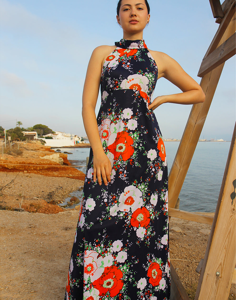 Embrace retro charm with this 70s vintage dress in a navy blue floral print. A breezy sleeveless maxi dress with a classic band neckline and rear hook fastening, it’s the perfect summer dress for warm days with a touch of boho flair.