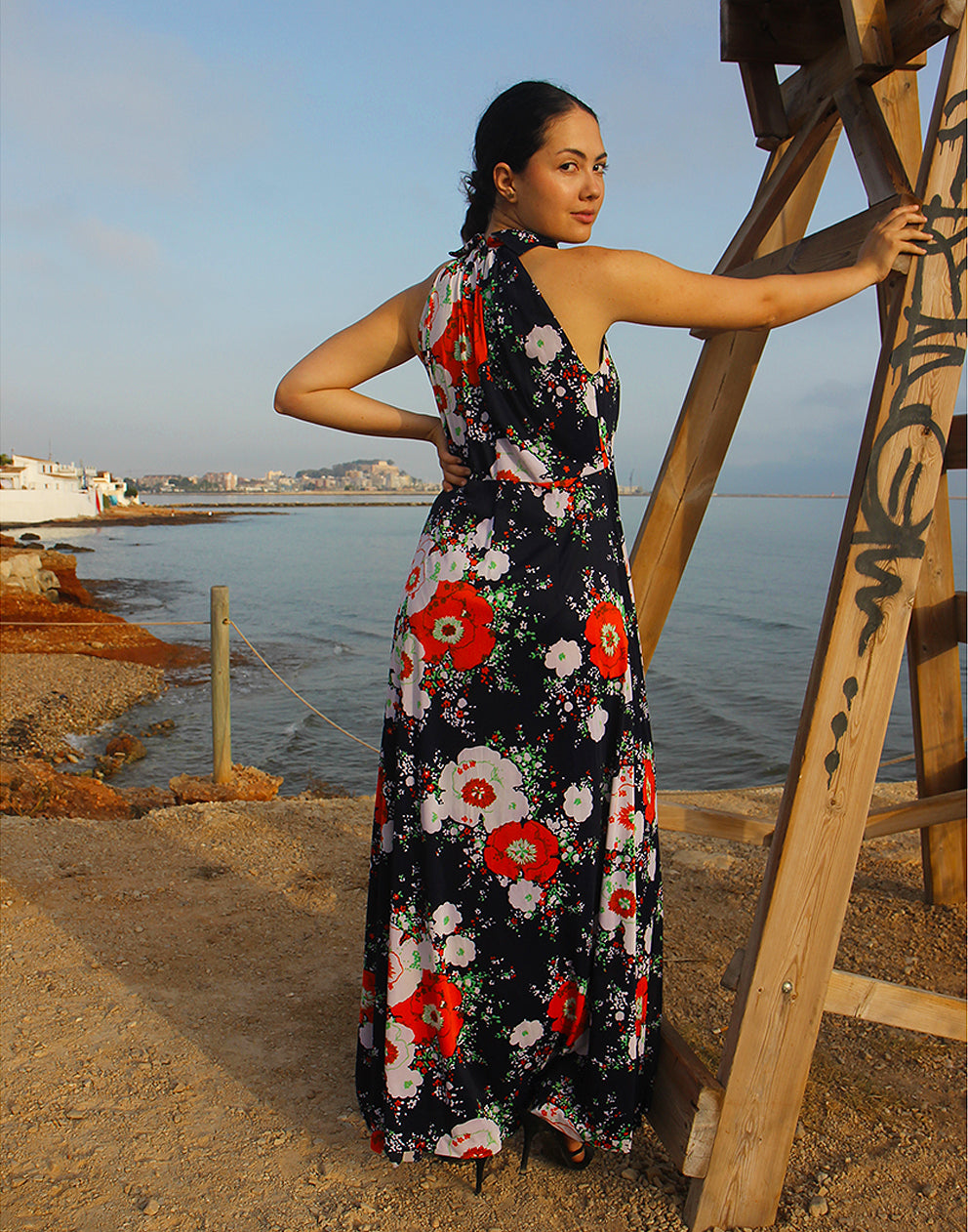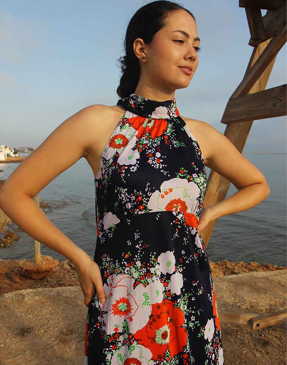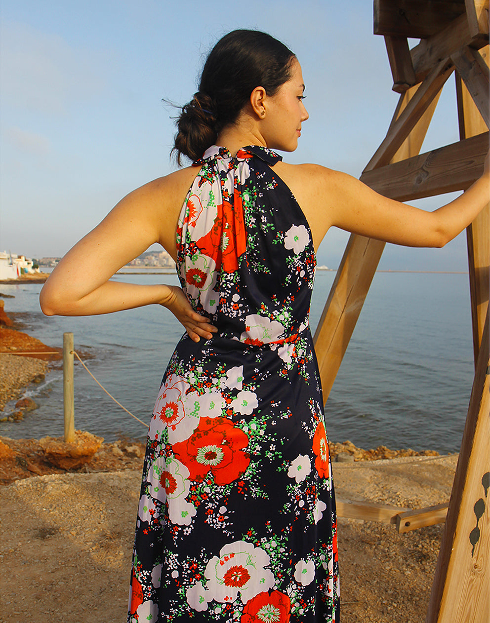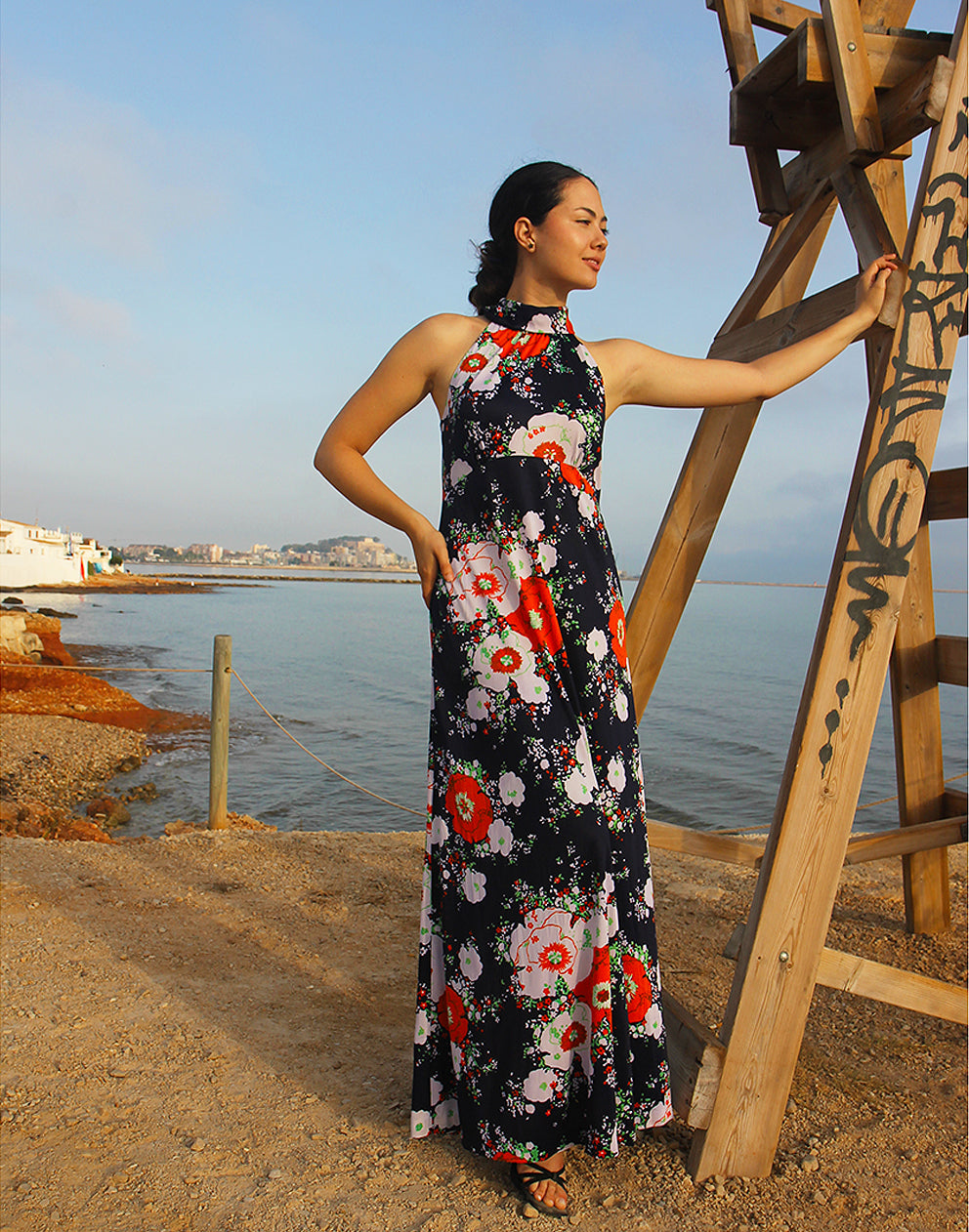 Embrace retro charm with this 70s vintage dress in a navy blue floral print. A breezy sleeveless maxi dress with a classic band neckline and rear hook fastening, it’s the perfect summer dress for warm days with a touch of boho flair.