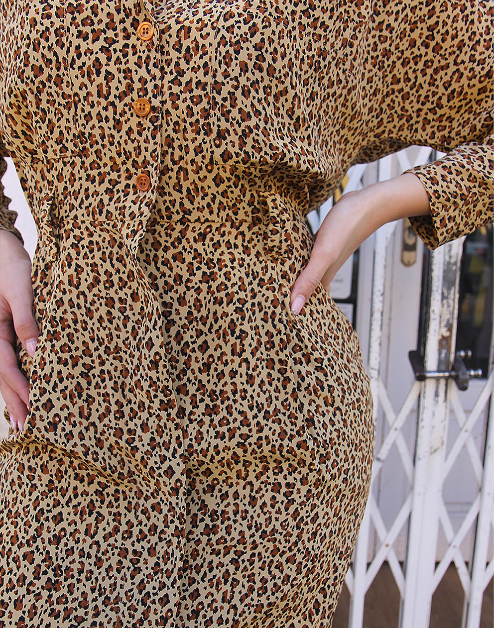 Elevate your style with this silk leopard print dress, designed with a collared V-neckline, long sleeves, and a flattering midi dress silhouette. Features two chest pockets, two lower pockets, a lined skirt, and buttons with zipper fastening. Belt loops allow for easy styling. A standout silk dress for day or night.