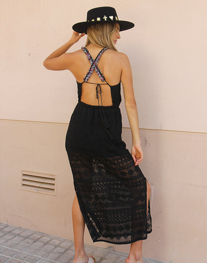 Turn heads with this stunning black midi dress, the perfect mix of elegance and edge. Designed with a sheer geometric print and a flattering crossover top, this sexy black dress features an eye-catching open back with adjustable tie straps for your ideal fit.