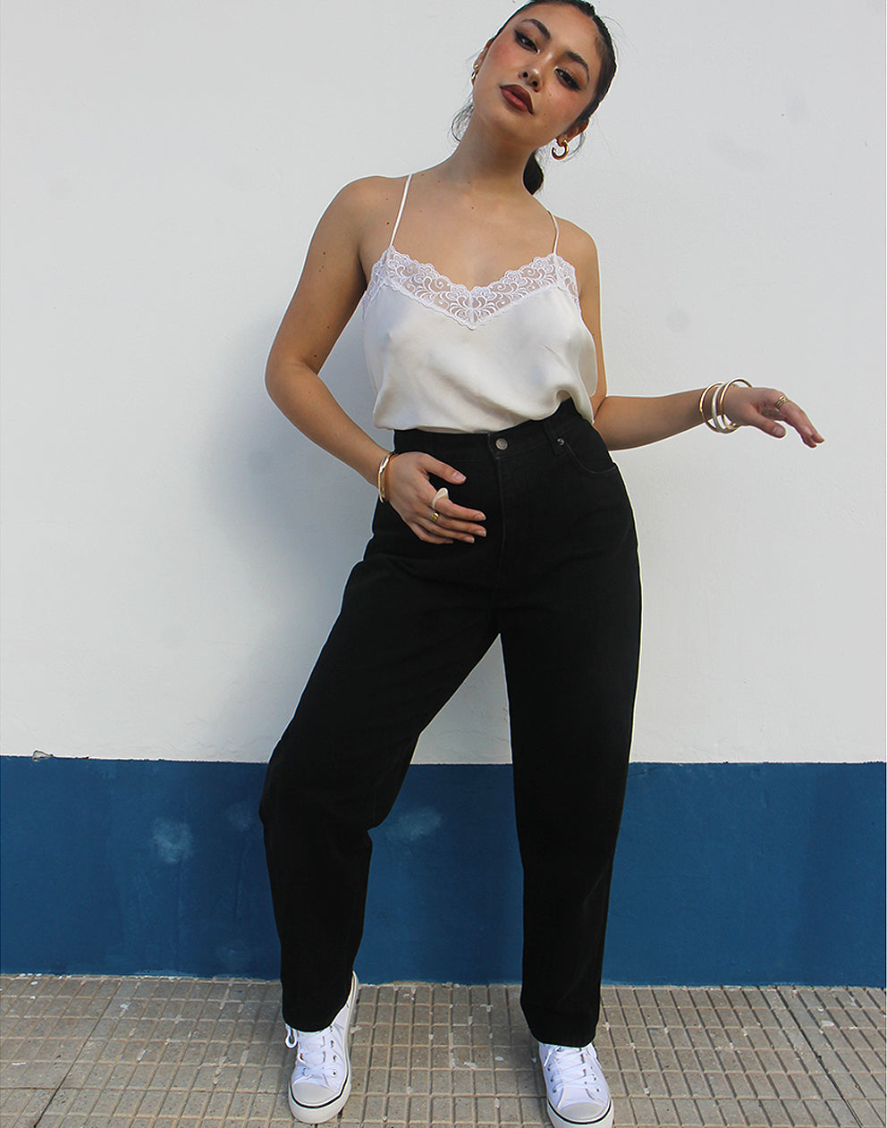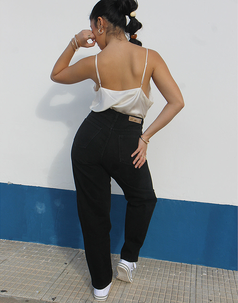 High waisted jeans in a heavy weight 100% soft cotton black denim, with a wide tapered leg that narrows perfectly at the ankle. Designed with extra space through the hips to contour an hourglass figure with more curves. No waist gap, just a secure fit at your narrowest point with intentional volume where you need it.