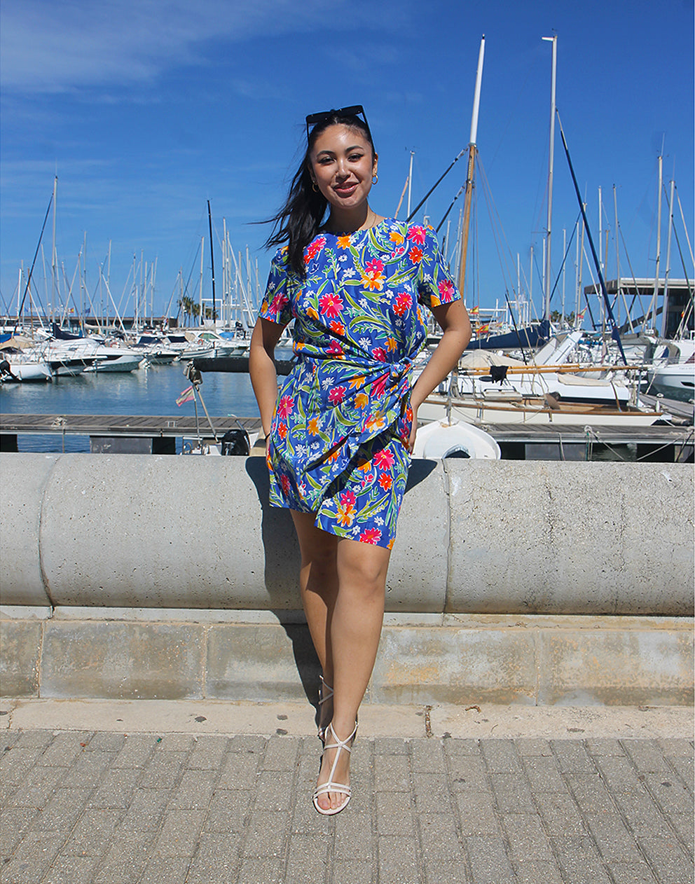 This lightweight 100% silk blue short sleeve dress with multi colour floral print. A summer dress with a crew neckline and wrap skirt with side tie. Rear button fastenings.
