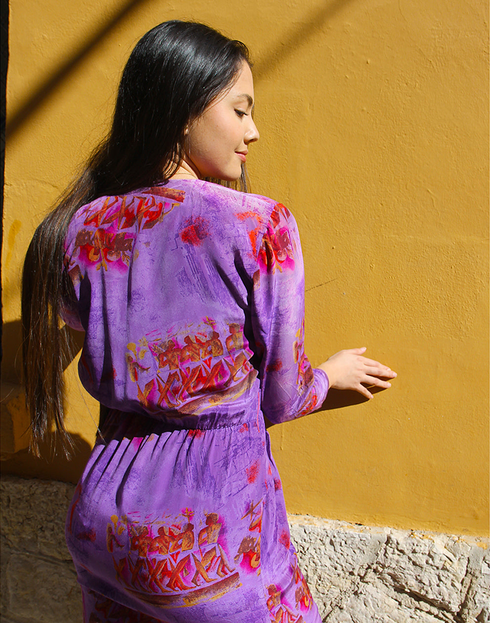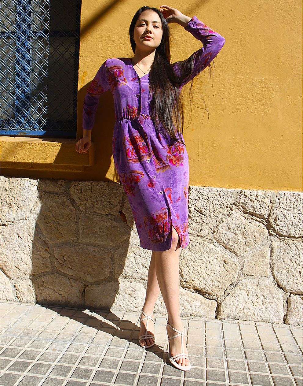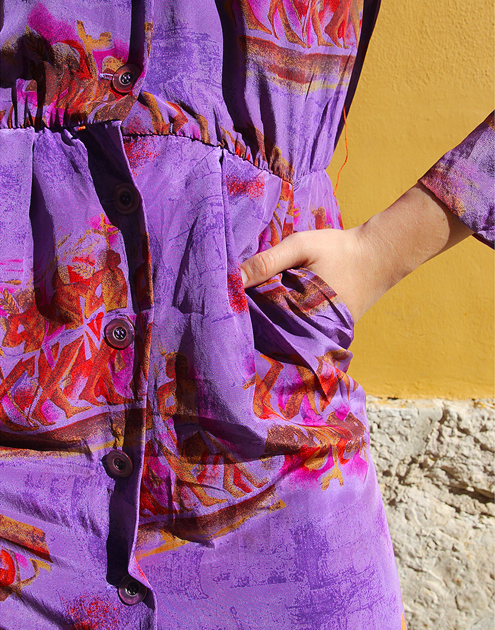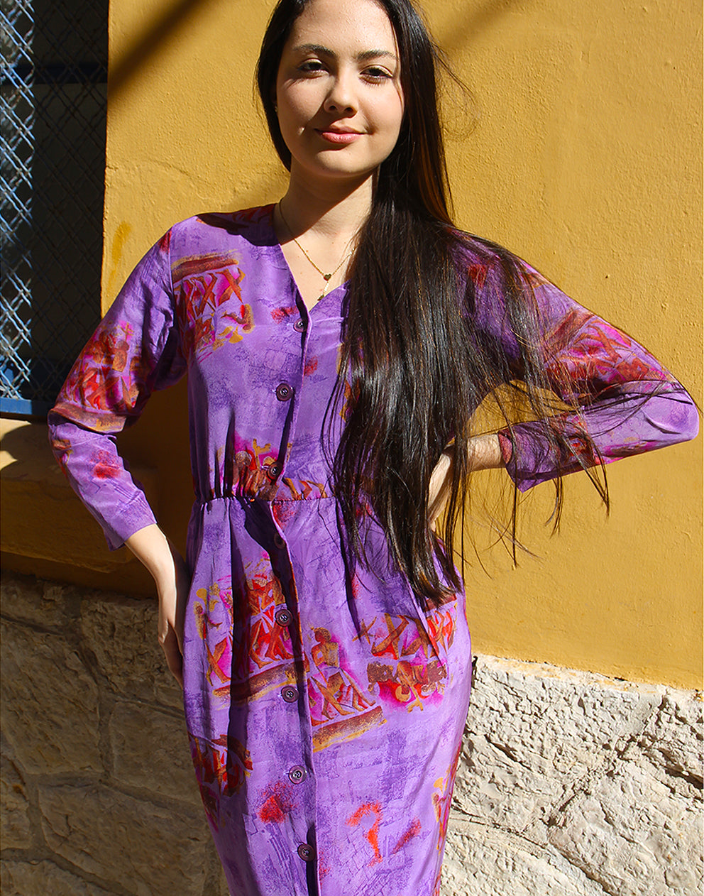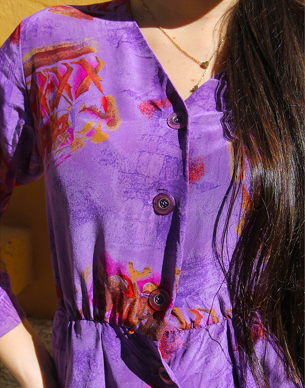 Purple silk dress with a soft abstract print and midi dress silhouette. Includes a V neck, buttoned upper section, elasticated waist, and pockets.