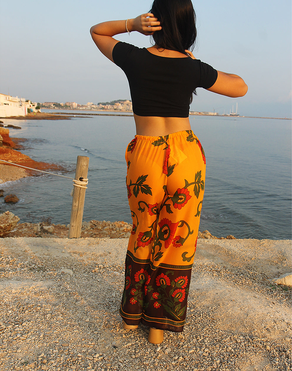 Brighten up your wardrobe with these high-rise floral trousers, featuring a bold orange print and breezy wide leg silhouette. Made from fine, slightly sheer fabric with an elasticated waist for effortless comfort and flowy summer style.