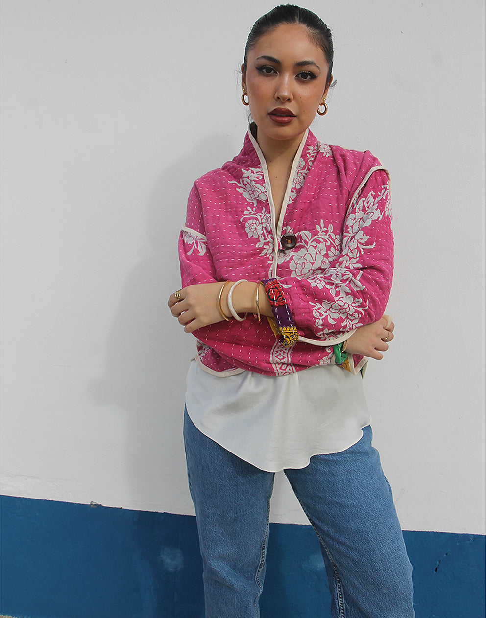 Lightweight pink jacket crafted from 100% cotton. Featuring a soft quilted design, this versatile cotton jacket is fully reversible—one side in pink, the other in green—giving you two looks in one.