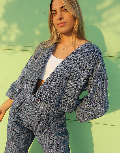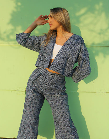 Sharp, clean lines define this women’s two piece made from upcycled vintage fabric. The cropped bolero jacket features 3/4 sleeves and a pleated back. Paired with high-rise wide leg trousers with a partially elasticated waist for comfort and structure.