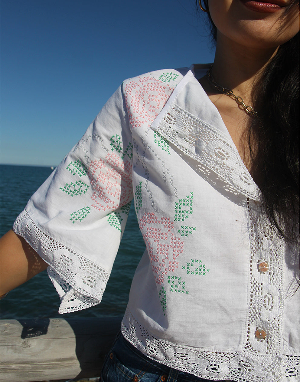 Womens short sleeve cotton blouse with crochet trims and embroidered floral details. Designed with half wide sleeves, crew neckline and buttons to fasten. Pair with your favourite pair of vintage denim jeans.